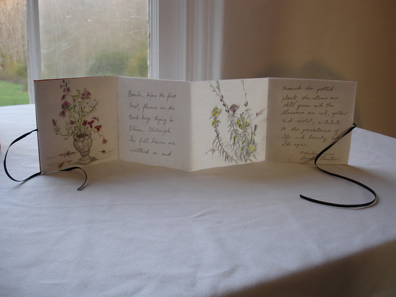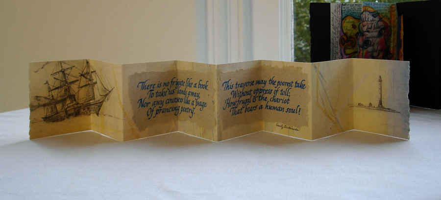 Handmade accordion book: Emily Dickenson poem, “There Is No Frigate Like a Book”